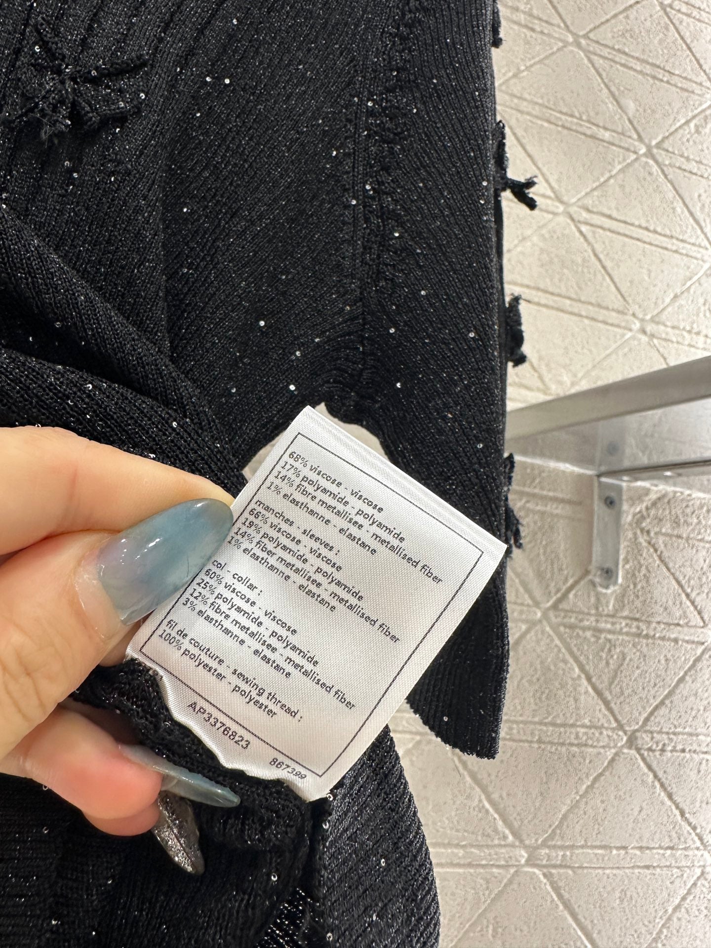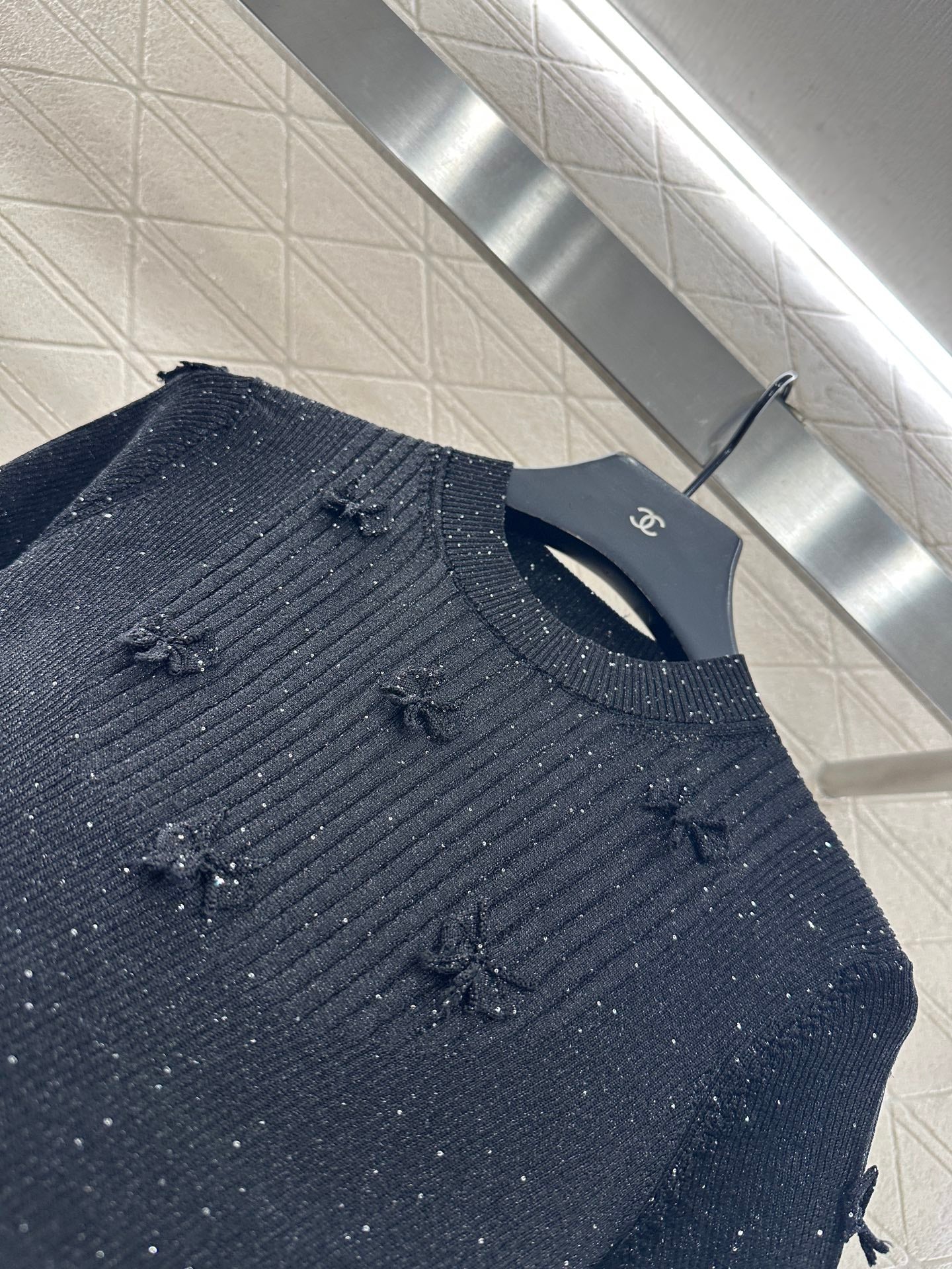 Crafted from cashmere yarn, it is soft and delicate, with a comfortable texture. The round neck knitted short sleeved shirt is decorated with multiple three-dimensional camellia shapes on the front chest, highlighting the brand's style. The design is rich in layers, and combined with threaded elastic edging, it is more slimming. The black base color is embellished with sequins on the surface, which is low-key and textured. The elastic fabric fits the body, and the upper body shows elegance and generosity.