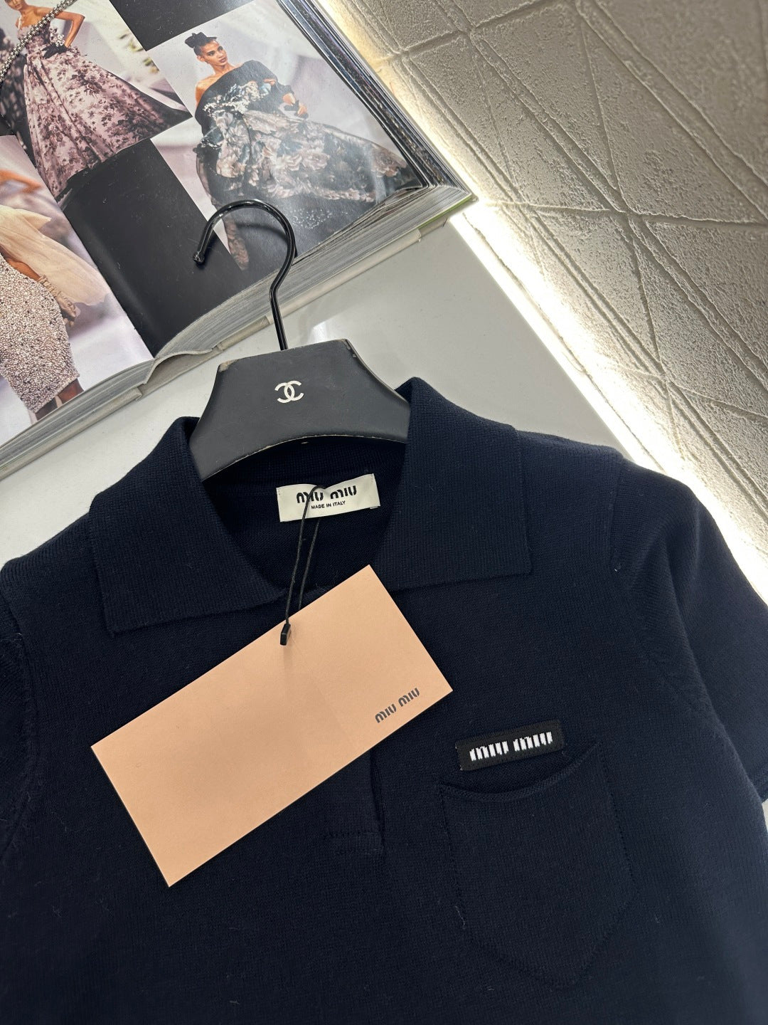 Wool yarn, fine knit, soft and comfortable against the skin. Features a half-open collar design, a single chest pocket adorned with a logo, highlighting the brand's style. The three-dimensional cut creates a fashionable look, adding depth and texture. Stylish and chic, perfect for wearing alone or layering