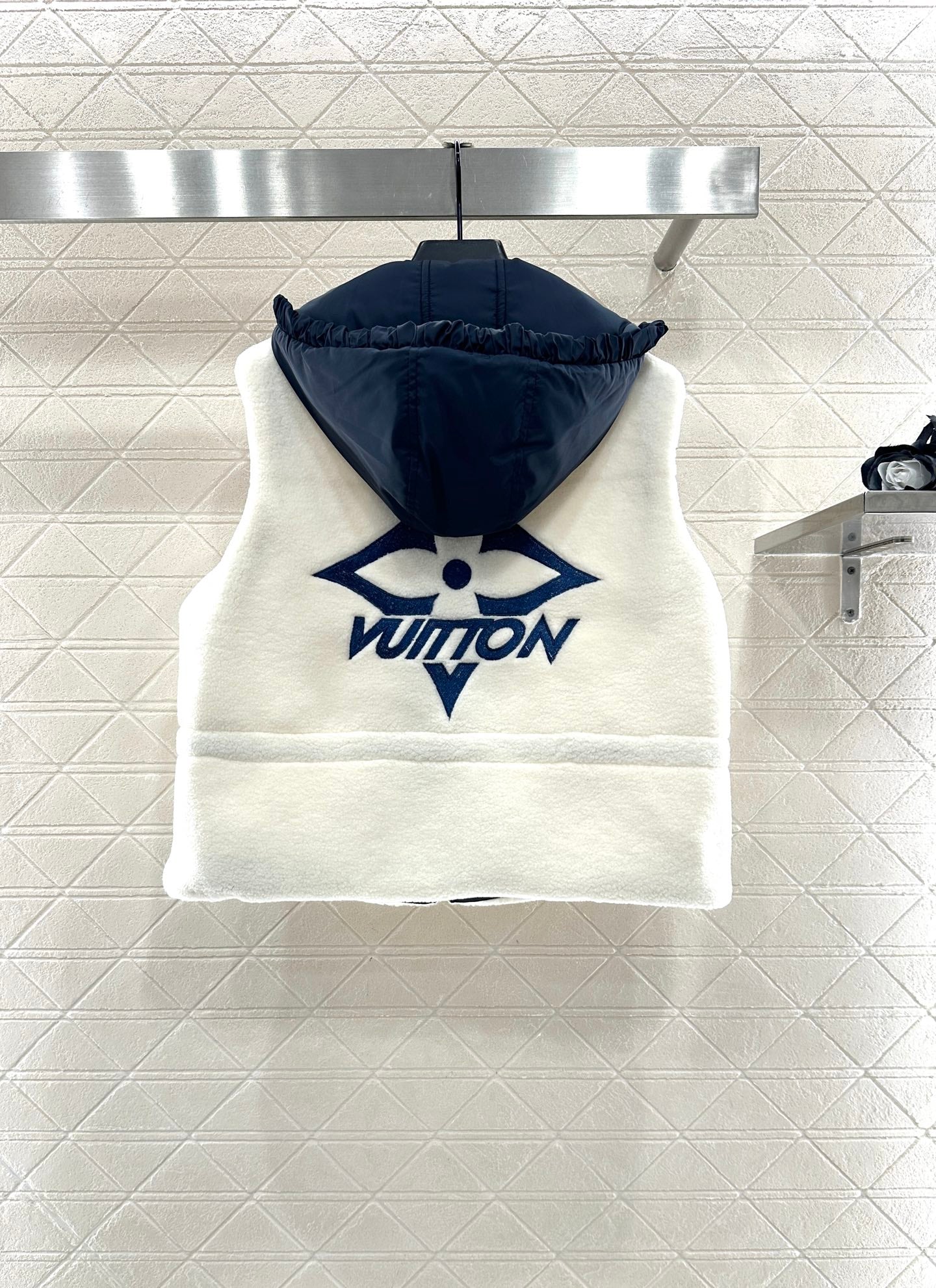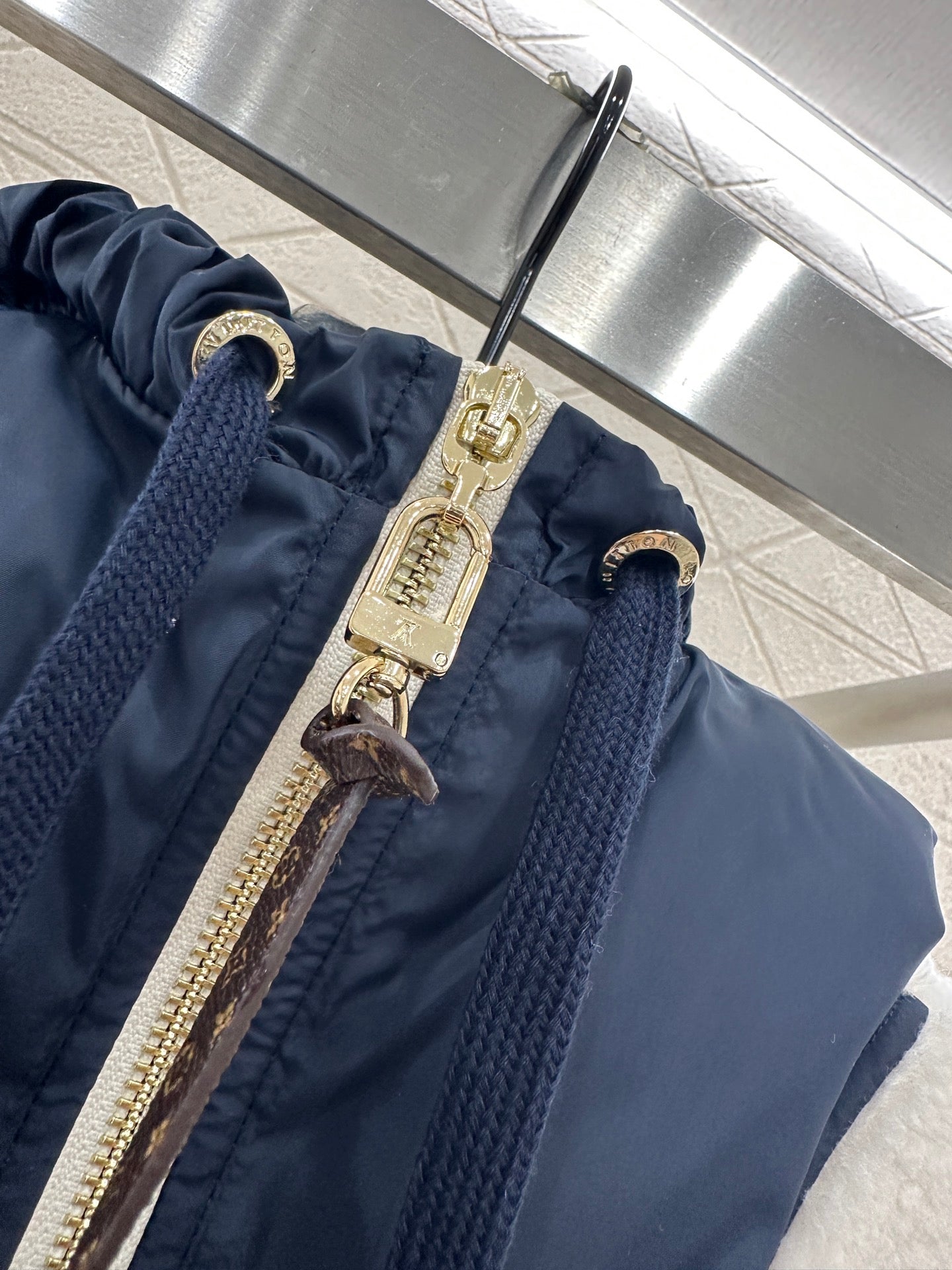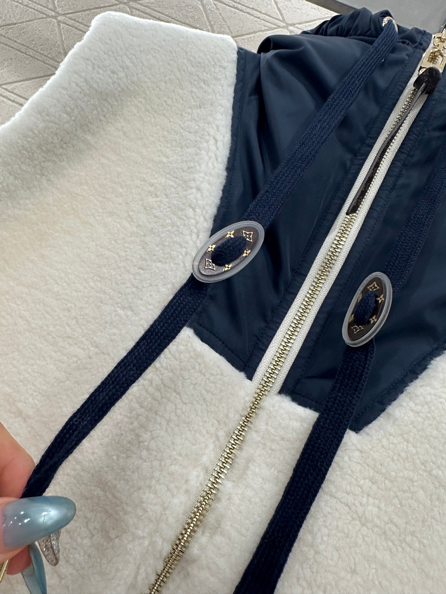 Teddy lamb wool material, sufficient wool volume, windproof and cold proof, hooded vest cut, with obvious lamb wool particles throughout the body, thick and warm, color blocking collision embellishment with four leaf clover letters, nylon edging outline ➕ Exquisite details such as vintage leather buckles, fully breathable mesh inside, showcasing brand style, adding high-end colors, suitable for more dressing occasions and personal styles, regular loose fit, fashionable and inclusive, versatile for autumn and winter.