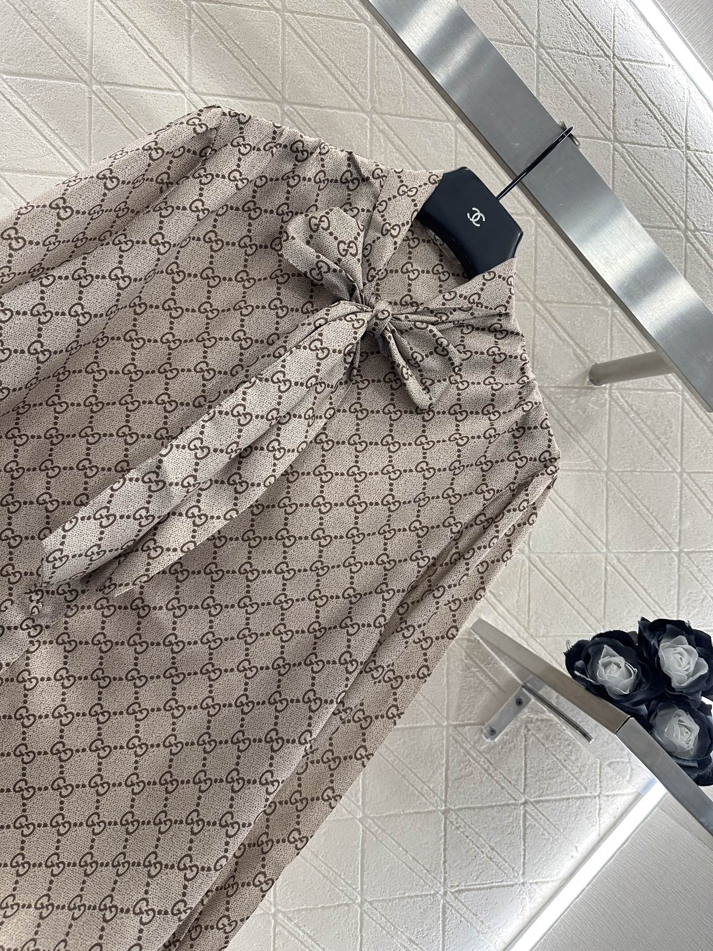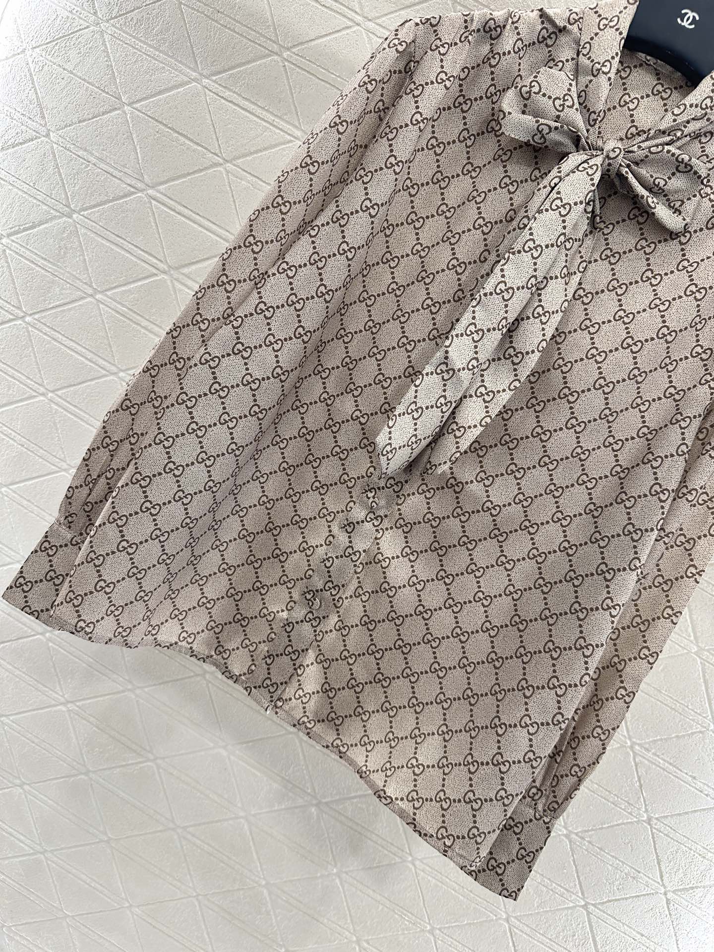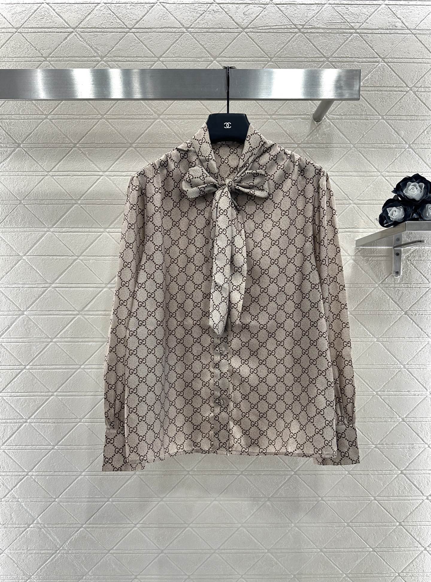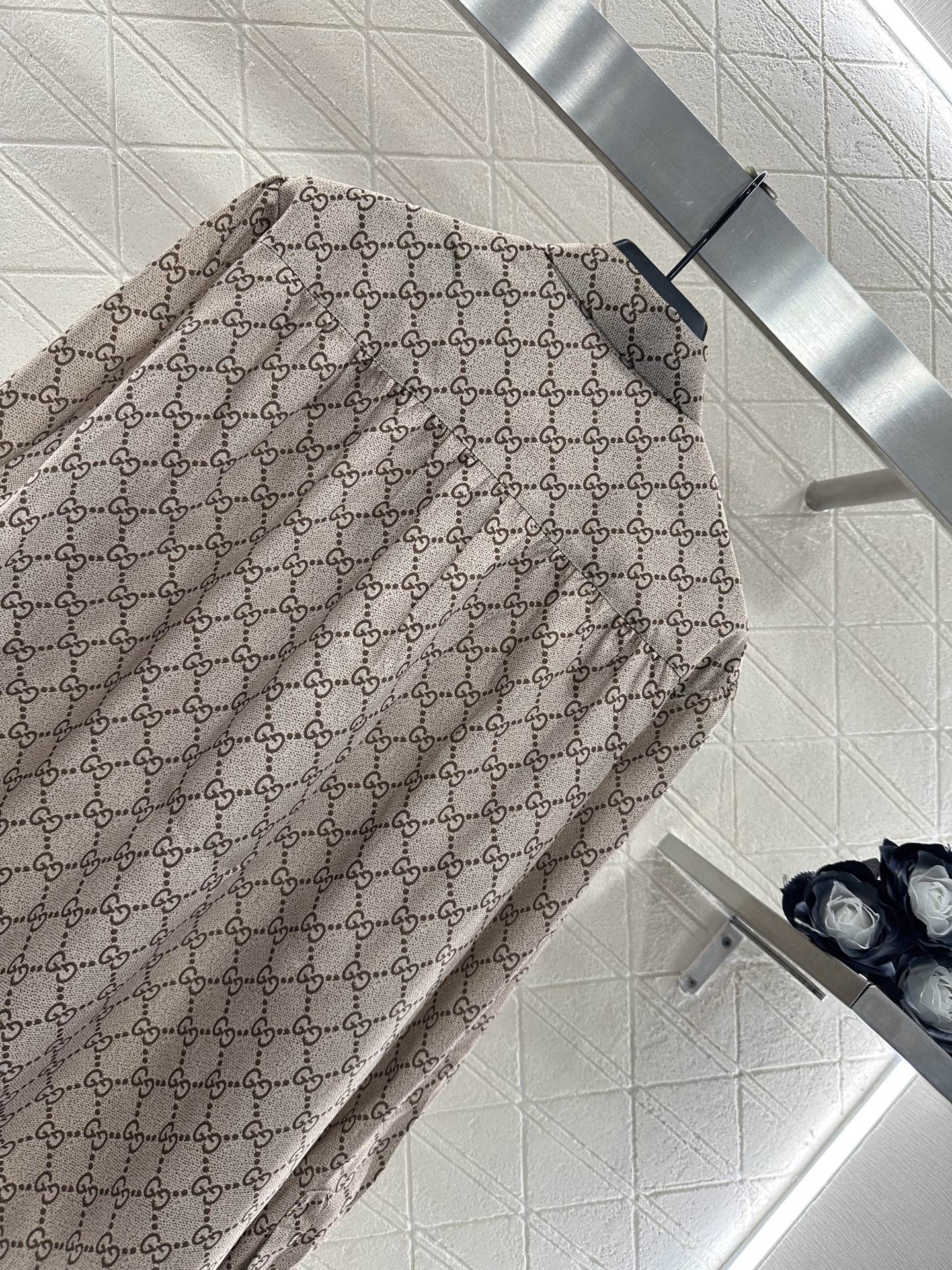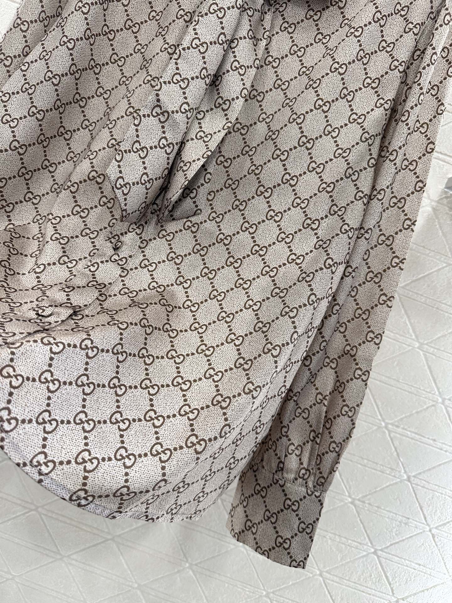 The twill thick material has a high-end texture and a smooth luster. The lapel shirt is cut with a straight tube and a full sense of material, visually slimming. The large body is covered with double G prints distributed in diamond grids, and the collar ribbon is used as a bow. The design is rich and gorgeous, creating a brand exclusive temperament style, making the matching more fashionable and western-style.