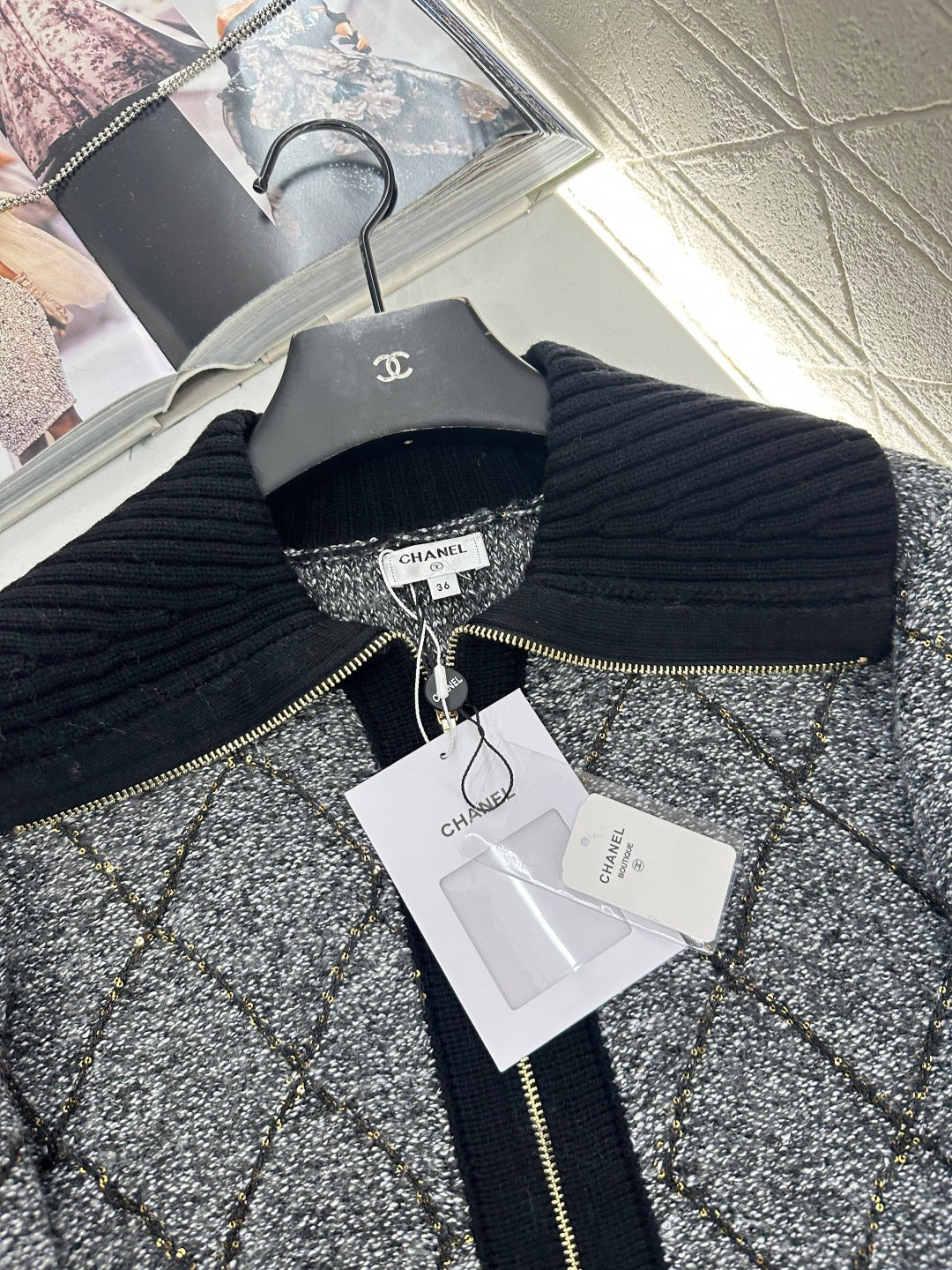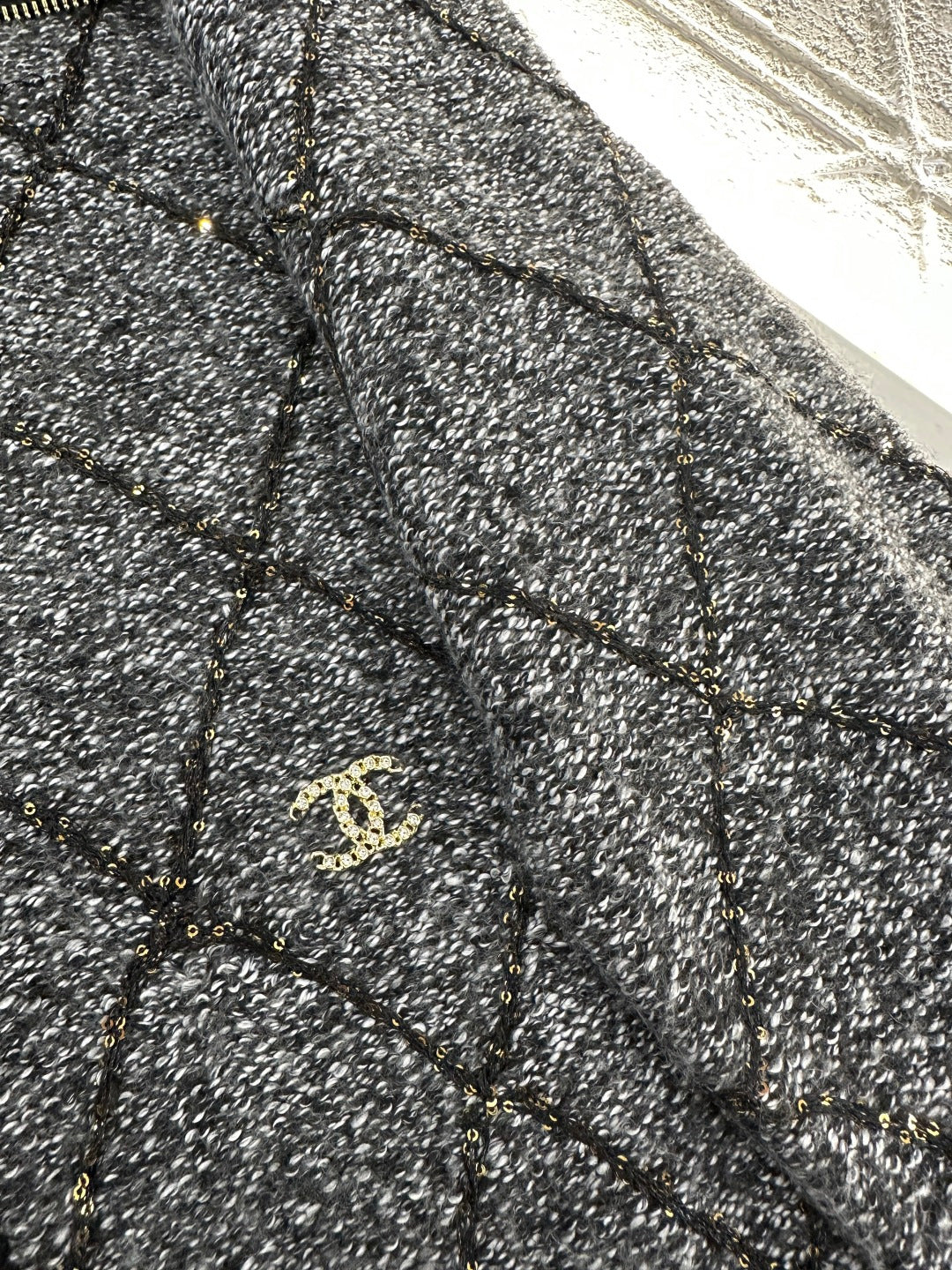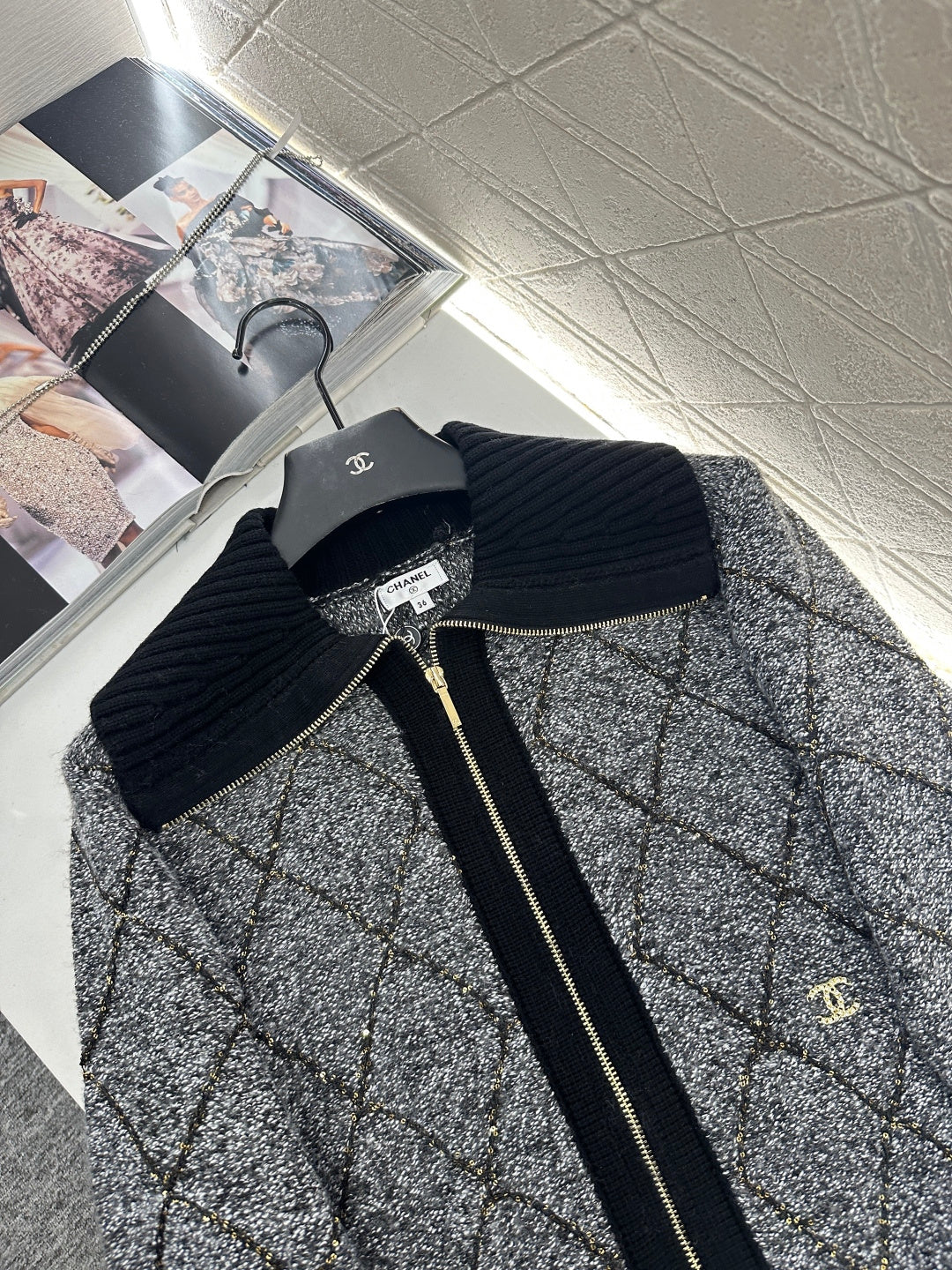 Woven from wool yarn, comfortable and warm, with superior texture. The large collar knitted jacket has a design with a grooved neckline and adjustable zipper opening. When worn as a cardigan, the sweater appears more relaxed in construction. The hem and cuffs of the finished garment are narrowed with knitted thread edging, giving it a high-end and stylish overall look. The entire body is covered with diamond grid texture, and the cross knit dividing lines are interspersed with sequins, making it more handmade when illuminated. Paired with the double C rhinestone brand logo details on the waist side, it adds a sense of style to the conventional versatile style, and the outfit is full of western-style style