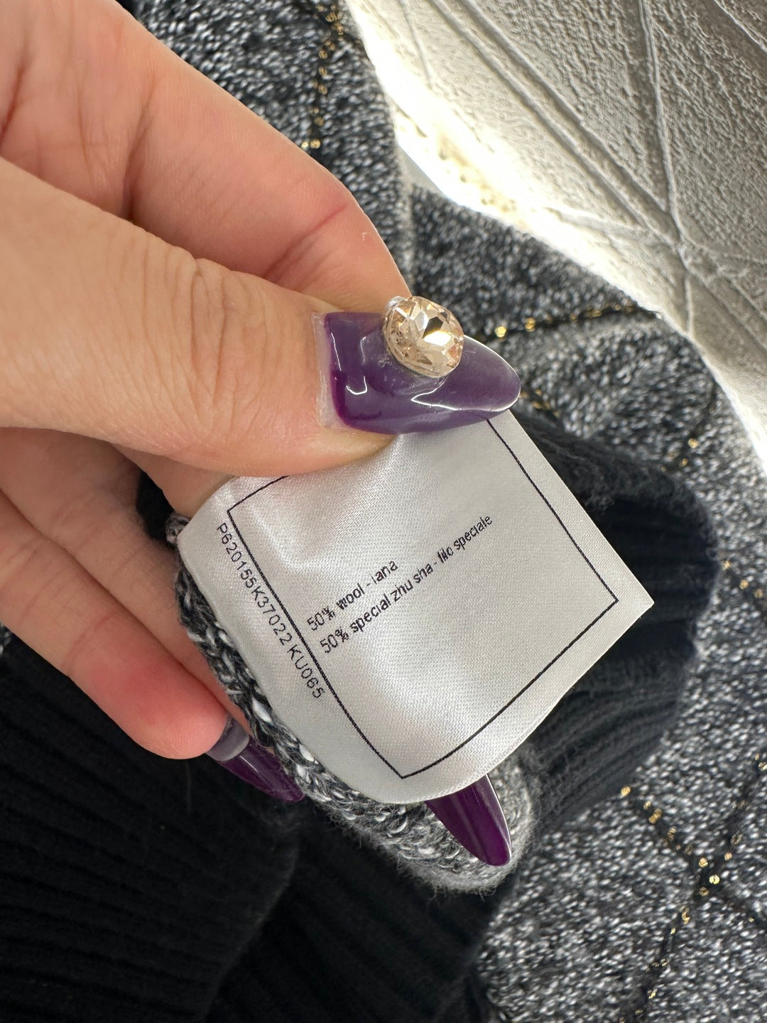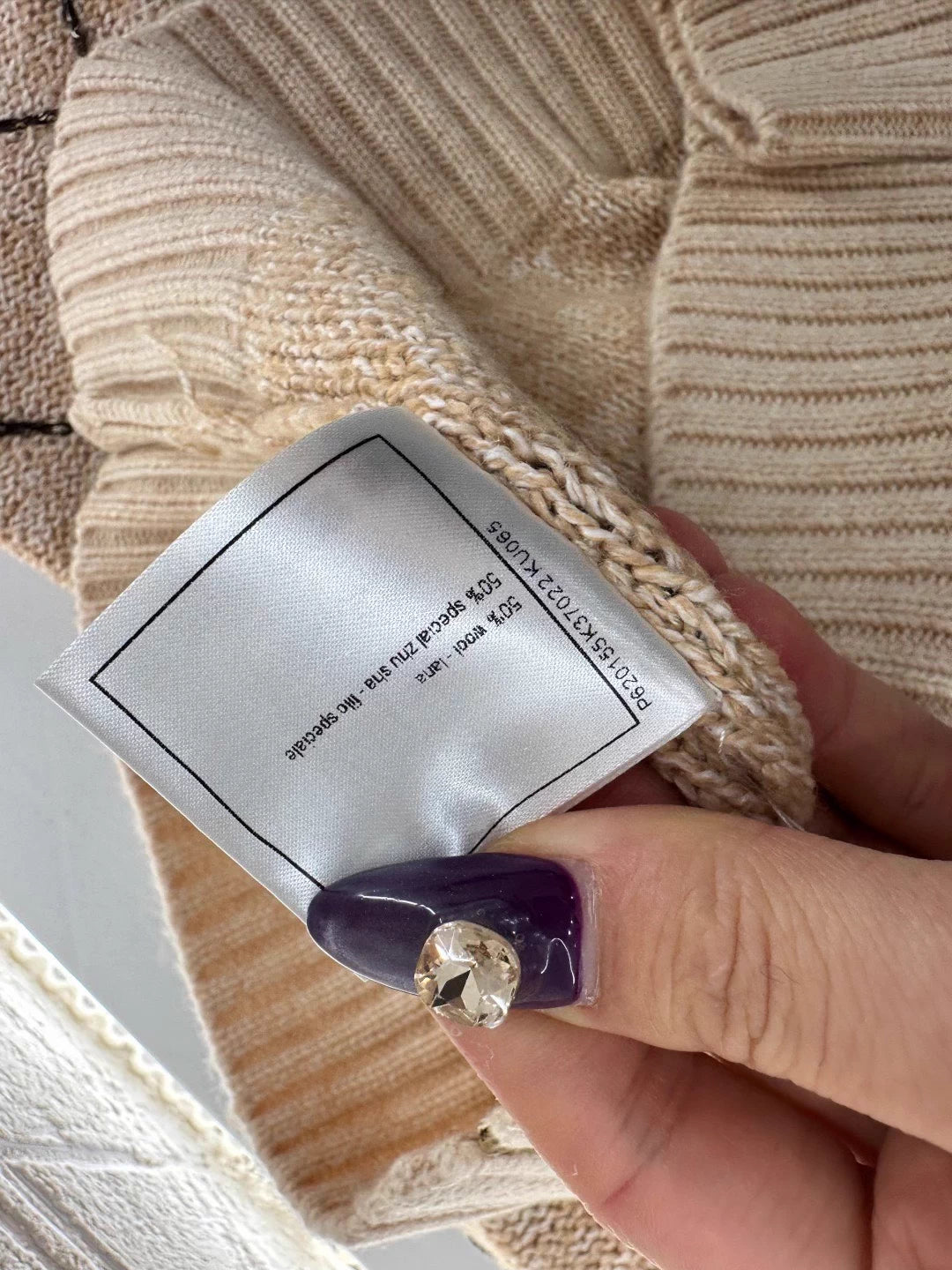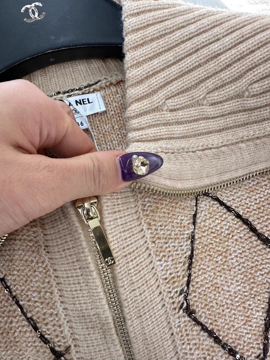 Woven from wool yarn, comfortable and warm, with superior texture. The large collar knitted jacket has a design with a grooved neckline and adjustable zipper opening. When worn as a cardigan, the sweater appears more relaxed in construction. The hem and cuffs of the finished garment are narrowed with knitted thread edging, giving it a high-end and stylish overall look. The entire body is covered with diamond grid texture, and the cross knit dividing lines are interspersed with sequins, making it more handmade when illuminated. Paired with the double C rhinestone brand logo details on the waist side, it adds a sense of style to the conventional versatile style, and the outfit is full of western-style style