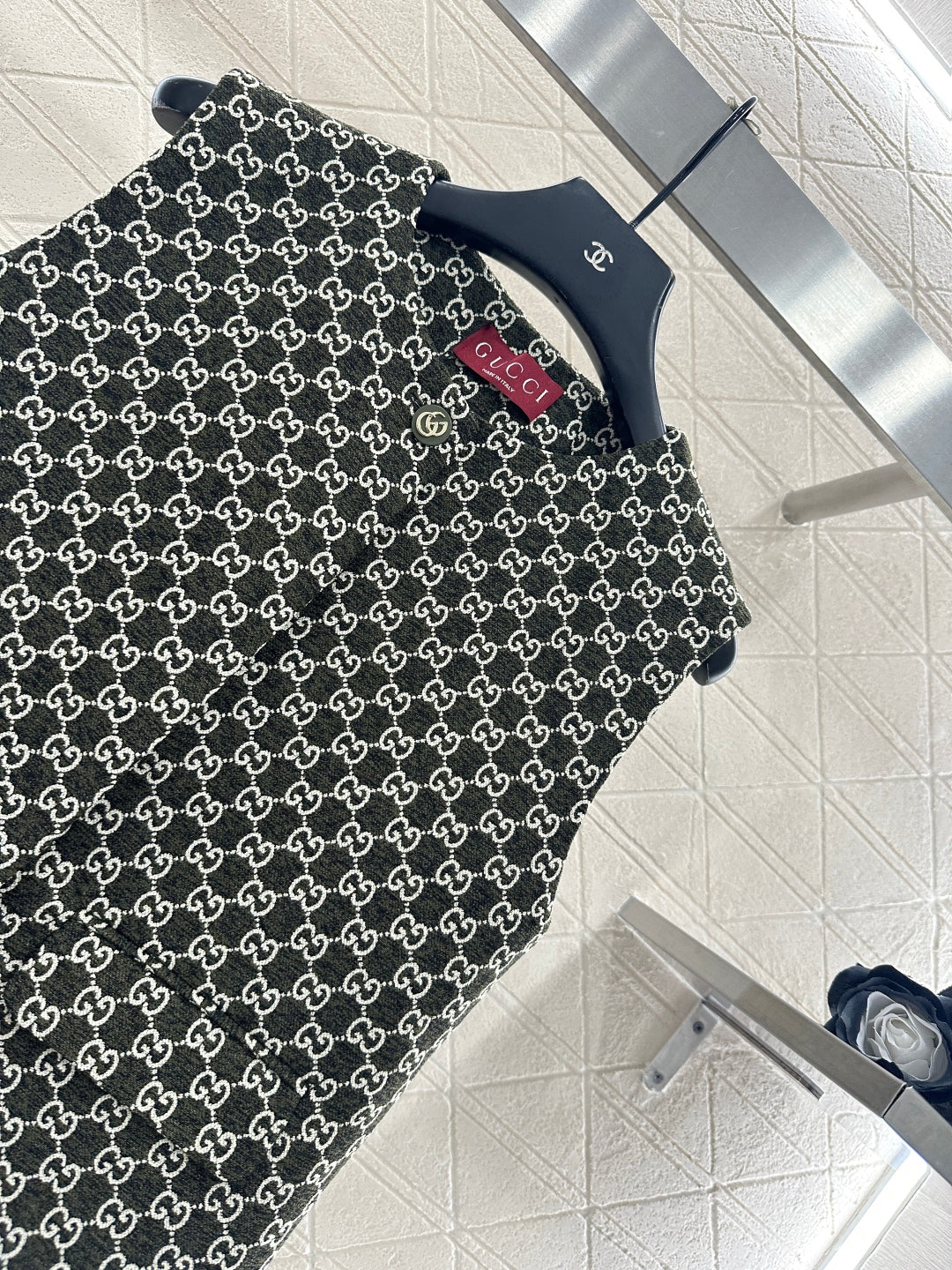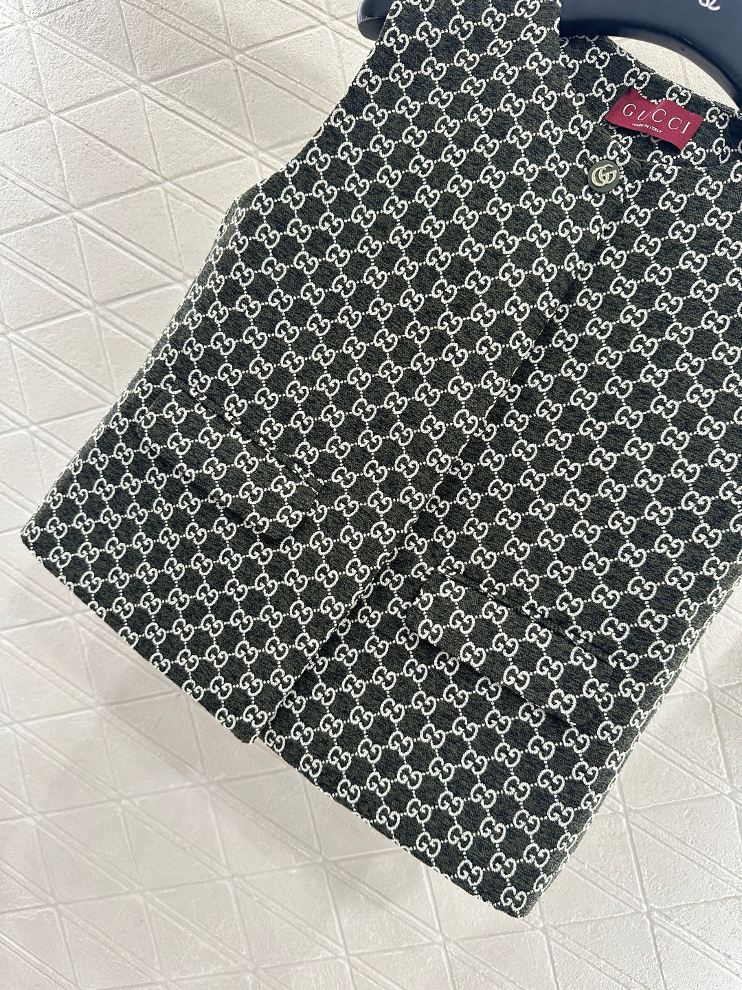 Made of wool jacquard material, the finished garment has excellent texture and appearance. The collar and shoulder suit short skirt set is tailored with a button open design and three-dimensional cutting to create a fashionable and neat style. The collar and front placket are single row engraved with letters and double G round buttons, and the large white green color scheme adds a sweet and elegant atmosphere. The details highlight the brand style. The flip pockets on both sides are matched with the same series of straight tube short skirts, and the details echo the must-have for autumn and winter. It looks tall and slim, versatile and can hold different occasions with a strong aura