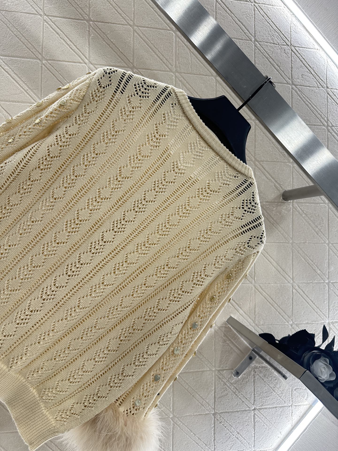 Weaved with sheep cotton yarn, it is soft and comfortable, with a stylish and slimming look. The round neck cardigan cut can be worn alone or as a jacket, with the shoulder and neck lines outlined by the front shoulder contour. The vertical hollowed out design is overlaid with sequins and pearl reflections, and the thread edging is exquisite and perfect. Paired with fluffy and lightweight feather decorations on both sides of the sleeves, it is rich in fashionable matching. With the reflection of light, it sparkles and swings with the movement, showing a romantic and gorgeous style. The solid color of the body is carefully processed with details, and casual matching is relaxed and fashionable, full of temperament.