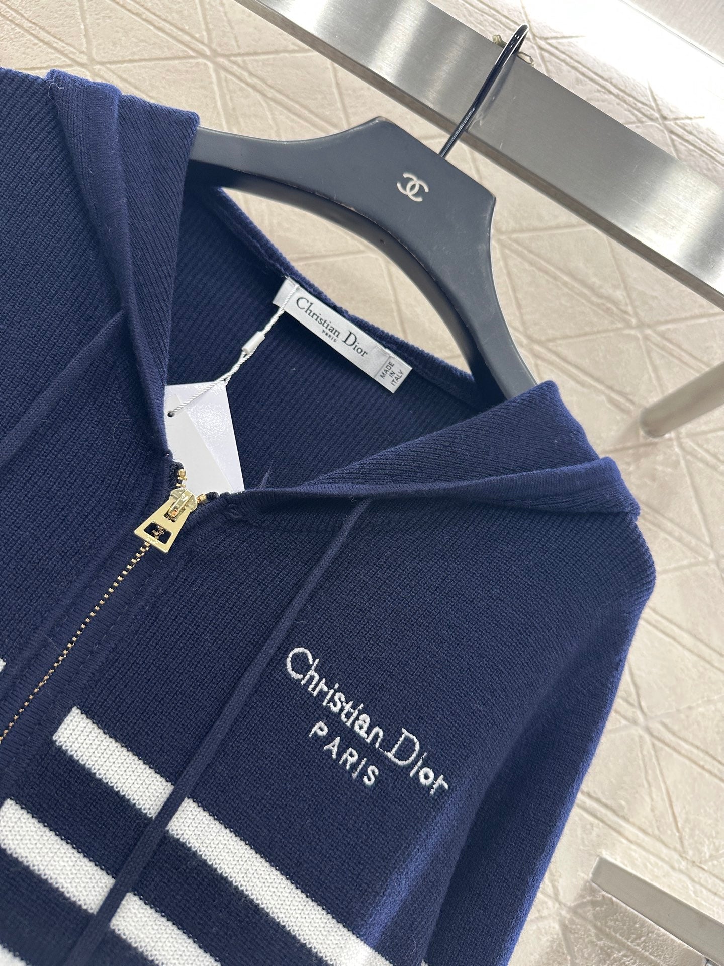 Woolen yarn weaving, fine knitting process with vertical pit strips, hooded jacket design, ready to wear drawstring zipper opening, elastic pit strip thread edging narrowing, embroidered letter logo on the chest, design maintains a unified tone, the overall look is high-end and casual, the two-color stripes below the chest are interwoven and embellished, collision creates a fashionable tone, and the elastic fabric is more inclusive, creating a brand's fashionable style.